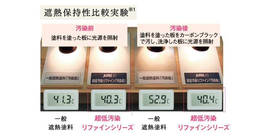4枚の板に同量の光源を照射したところ、超低汚染リファインシリーズを塗った板は、汚染前・汚染後でほぼ温度差なく、遮熱性が維持されていることが実証されました。